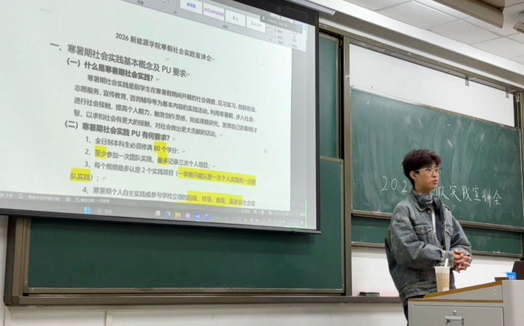 随着2025-2026学年第一学期的渐进尾声,2026年寒假社会实践活动亦渐次拉开序幕。为了让新能源学院的学生们更深入地掌握寒假社会实践的具体流程,积极投身于实践活动,并且高效地圆满完成任务,新能源学院团委实践部于12月24日精心策划并成功举办了寒假社会实践宣讲会及经验交流会。此次活动采取线上线下同步进行的方式,新能源学院团委实践部全体成员、2025级全体学生以及其他年级参与寒假实践的同学共同参与。本次会议由实践部部长黄贵扬主持,并特邀了历届“源泉工程”优秀实践团队的负责人王宇轩、马飞艳来分享他们的宝贵经验。