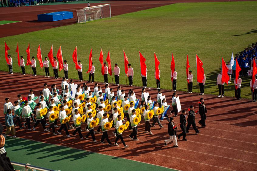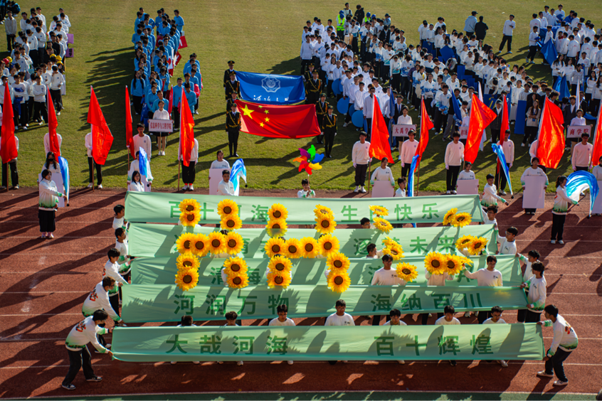 新能源学院代表方阵在副院长程亚军教授及各位带队老师的引领下,迈着铿锵有力的步伐走过主席台。“百十新荣光,赋能向未来!”嘹亮口号响彻赛场,尽显新能学子的昂扬斗志与奋进姿态。学子们手持向日葵组成“HHU”“百十”等字样,向百十校庆献礼,祝愿河海欣欣向荣,一路生花,同时也诠释着新能源学子阳光向上的精神风貌。蓝白渐变的彩旗迎风招展,是“水之子”传承江河情怀的生动写照,灵动姿态宛若游鱼逐浪、飞鸟凌云。青绿色横幅醒目亮眼,既象征学院深耕绿色能源领域的发展初心,又与学子们的蓬勃朝气相融,与赛场草地相映成趣,更与鲜红国旗交相辉映,成为开幕式上一道独具新能特色的靓丽风景线。